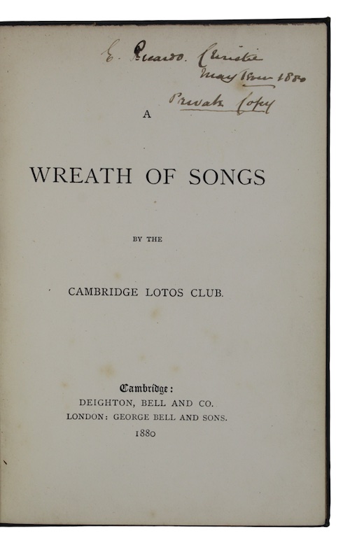 The sole edition of an anthology of verse composed by the Cambridge Lotos Club, 'a little gathering of Undergraduates'; dedicated to historian and senior fellow of King's College, Oscar Browning (1837-1923). A second (and final) series, New Songs, appeared in 1881.