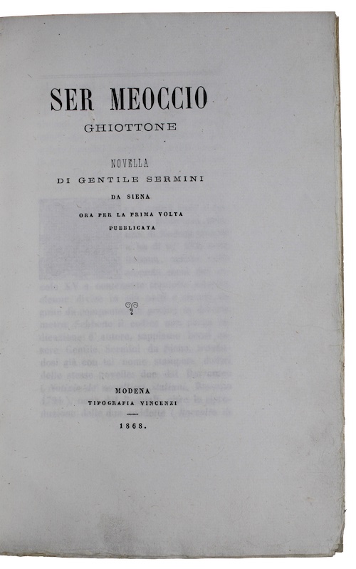 An attractively bound copy of a previously unpublished novella, limited to 100 copies, by an obscure fifteenth century Sienese author, of whom little is known other than that around 1424 he composed a collection of forty novellas, largely risque and scandalous in tone.