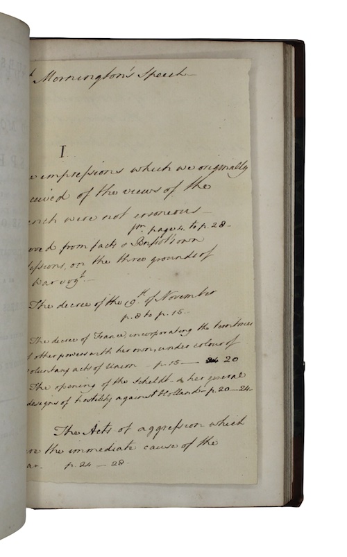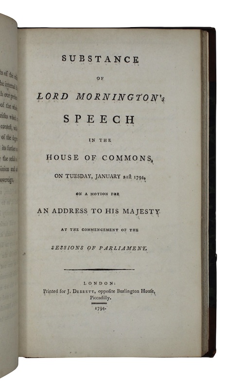 [And:] [WELLESLEY, Richard Wellesley, Marquess]. Substance of lord mornington's speech in the house of commons, on tuesday, january 21st 1794, on a motion for an address to his majesty at the commencement of the sessions of parliament. London. Printed for J. Debrett, 1794. First edition. [2], 176pp. Without half-title and preliminary errata leaf. ESTC T48783.