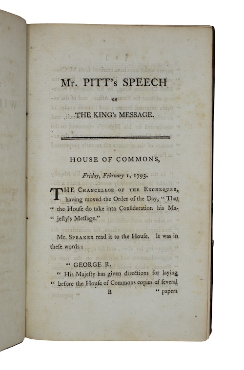 [Bound with:] PITT, William. Speech of the right honourable william pitt, delivered in the house of commons, monday, february 3, 1800, on a motion for an address to the throne, Approving of the Answers returned to the Communications from France relative to a negociation for peace. London. Printed [by S. Gosnell] for J. Wright, 1800. First edition. [2], 120pp. Without half-title. ESTC T143582.