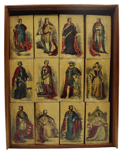 A handsome Victorian block-based game portraying the monarchs of England, from William I to Victoria. Any challenge to a juvenile recipient in placing the blocks in chronological order is somewhat diminished given they are sequentially numbered.