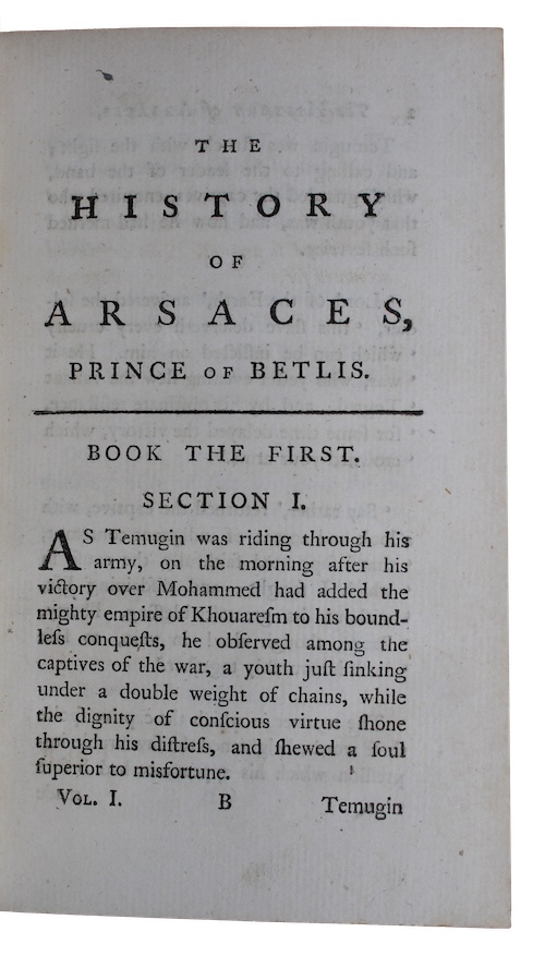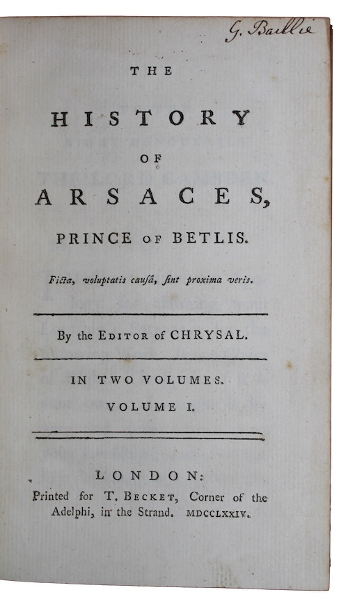 The first edition of Irish author and journalist Charles Johnstone's (c. 1719-c. 1800) oriental satirical fantasy novel, a thinly-veiled anti-colonial narrative in which the protagonist ventures to Egypt, Baghdad, and Mecca. There are references to the East India Company (in the wake of the Bengal Famine), and allusions to ongoing troubles in proto- Revolutionary America. The book was not received with the same populat acclaim as Johnstone's early narrative-of-an-object novel Chrysal, or, The Adventures of a Guinea (1760-1765); indeed, none of his subsequent works would find a wide audience, resulting in him facing a dotage of penury (in part due to being a victim of an unscrupulous publisher). As a result, Johnstone sailed for India in hopes of prevailing on the generosity of those he had helped into positions of favour during more prosperous times. He found employment by writing for the Bengal newspaper press under the signature of Oneiropolos. He later became proprietor of a journal, which allowed him to amass something of a fortune by the time of his death in Madras around 1800.
