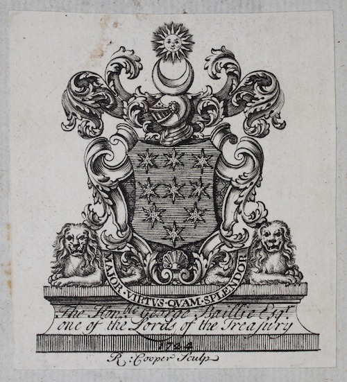 The bookplates of politician and junior Lord Commissioner of the Treasury George Baillie (1664-1738) present in this copy are dated 1724; chronology makes this obviously impossible. The early owner, who has inscribed the head of each title, must surely have been George Hamilton (1723-1797), second son of Baillie's second daughter, who inherited the estates on the proviso that he adopt the surname Baillie.