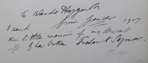 [6], 96pp. Contemporary gilt-tooled half-vellum, blue cloth boards, gilt supralibros to upper board, A.E.G. A trifle marked and discoloured. Marbled endpapers, occasional spotting. Inked inscription to recto of front blank fly-leaf: 'To Blanche Hoggarth / from Spencer 1907 / I send this little memoir of my dearest / wife by her brother Frederick Seymour'.