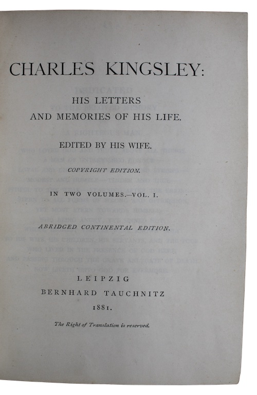 The abridged Continental edition of the collected memoirs and correspondence of Church of England clergyman and novelist Charles Kingsley (1819-1875), edited by his wife.