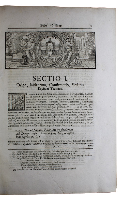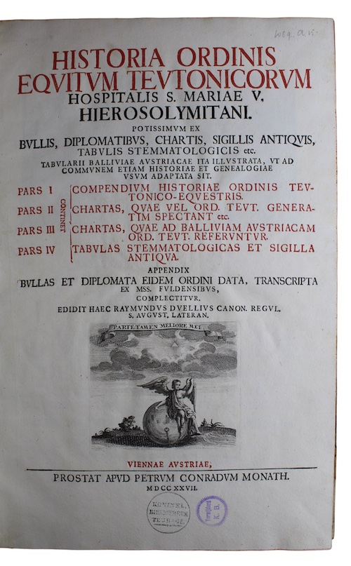 A crisp copy of the sole edition of a history of the Teutonic Order published by Austrian Augustinian canon and historian Raimund Duellius (1693-1769) in collaboration with German antiquary Johann Friedrich Schannat (1683-1739).