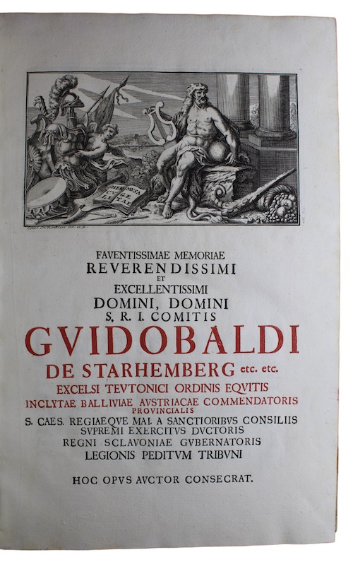 In four parts. [12], 56, 120, [2]pp, seven engraved plates (counted as 'pag. 123'-1'29'), 26 leaves of genealogical tables, (2), 21, (1), (22)pp. With a half-title and a final leaf of errata. Title in red and black. Contemporary half-vellum, marbled boards, title in manuscript to spine, all edges red. Lightly rubbed and discoloured. Ink library tamps to foot of title, else internally clean and crisp.