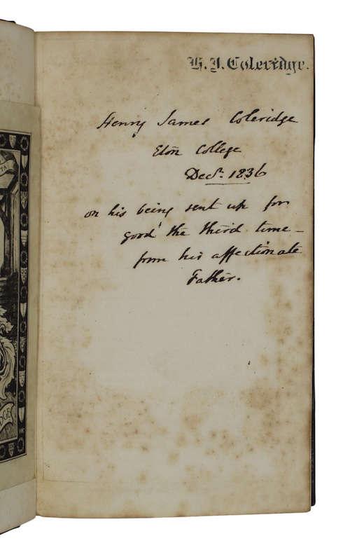 In three volumes. clxiii, [1], 168; viii, 311, [1]; vii, [1], 363pp, [1]. With an engraved portrait frontispiece to Vol. I. Contemporary dark green half-morocco, marbled paper boards, lettered in gilt to spines, A.E.G., marbled endpapers. A trifle rubbed. Very occasional light browning. Armorial bookplates of Bernard Lord Coleridge to versos of FFEPs, ink-stamp of H. J. Coleridge and inked gift inscription 'Henry James Coleridge / Eton College / Decr. 1836 / on his being sent up for / good the third time - / from his affectionate / Father' to front blank fly- leaf of Vol. I., inked ownership inscriptions of same to front blank fly-leaves of Vols. II and III.