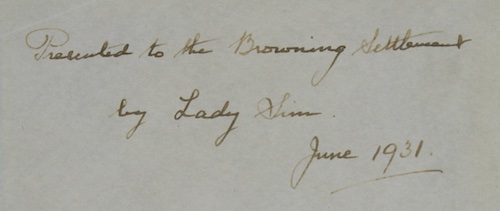 [4], 105pp, [3]. With a photographic portrait frontispiece. Original publisher's navy cloth, lettered in gilt to spine and upper board. A trifle rubbed, spine lightly sunned. Internally clean and crisp. Presentation copy, inked inscription to FEP: 'Presented to the Browning Settlement by Lady Sim. June 1931.'