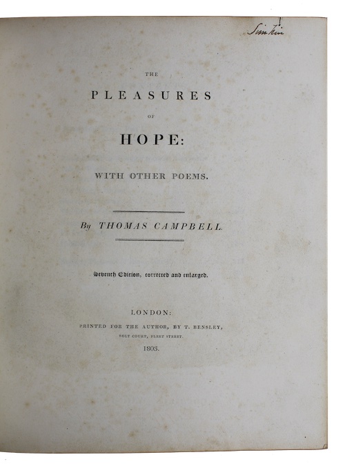 First published in 1799, The Pleasures of Hope marked the debut of Glaswegian poet Thomas Campbell (1777-1844). The didactic poem found immediate critical acclaim and commercial success, leading Campbell to be dubbed the 'Scottish Milton'.