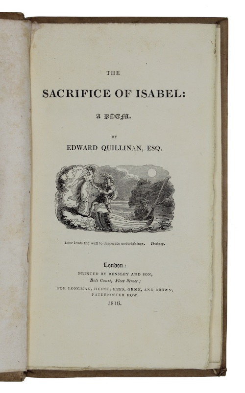 The first edition of one of Edward Quillinan's (1791-1851) earlier works, The Sacrifice of Isabel is the story of a pair of doomed lovers told through recollection- Quillinan describes the epic as 'so melancholy a cast'. Dedicated to bibliographer and politician Sir Egerton Brydges, a good friend and operator of the prestigious Lee Priory Press, in whose library the poem was written.