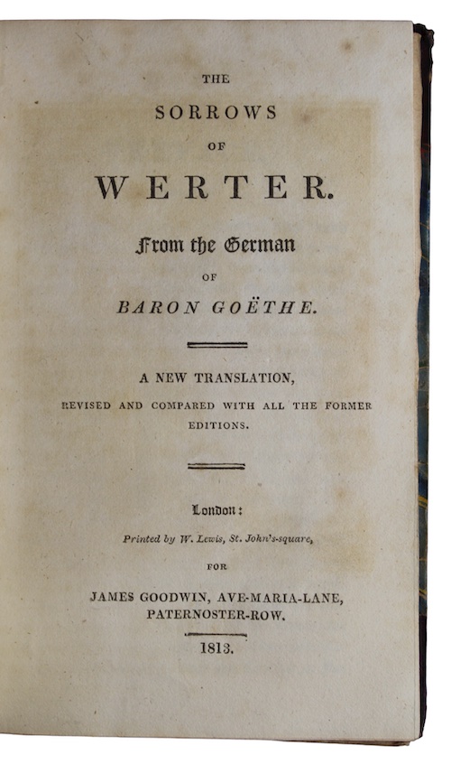 A new translation, purportedly 'revised and compared with all the former editions', of Goethe's perennially popular epistolary novel, a key text of the Sturm und Drang movement. The anonymous translator's prefatory remarks state: 'The present edition has been printed with a view to combine not only the real force and sentiment of Werter, as they are given by Mr. Goethe, but as a more perfect model of the author's manner, which has been much perverted, and often misconceived.'