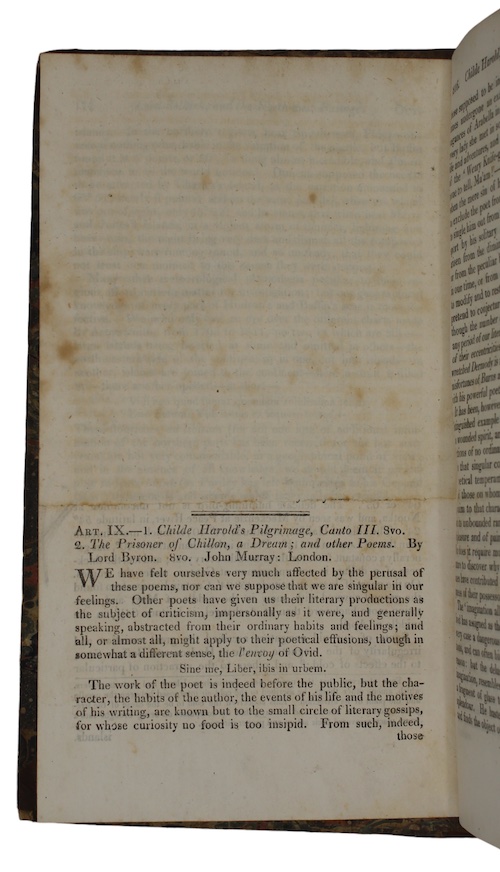 A coherent sammelband of ten articles, extracted from various periodicals, such as the Edinburgh Review, providing contemporary reviews of the works of Lord Byron; including, Childe Harold's Pilgrimage, The Giaour, Sardanapalus, The Two Foscari, and the Doge of Venice.