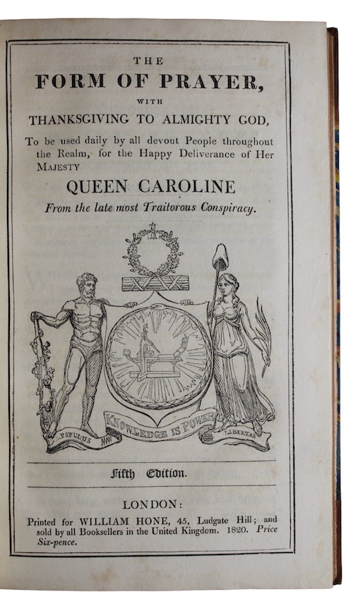 In 14 parts, The political house that Jack built (1821, 53rd ed.), The man in the moon (1820, 25th ed.), The Queen's matrimonial ladder (1820, 44th ed.), In Parliament. Dropt clauses out of the bill, against the Queen (s.d.), "Non mi ricordo!" (1820, 31st ed.), The form of prayer (1820, 5th ed. 1820), political showman--at home! (1821, 16th ed.), The right divine of kings to govern wrong! (1821), Bank restriction note, The bank restriction barometer, Buonapartephobia. (1820, 9th ed.), A slap at slop (1822), Aspersions answered (1824, 6th ed.), and Another article for the Quarterly review (1824, 2nd ed.). With 120 engravings by George Cruikshank. Contemporary half-calf, marbled boards, tooled and lettered in gilt. A trifle rubbed, paper shelf-label to foot of spine. Very occasional spotting.