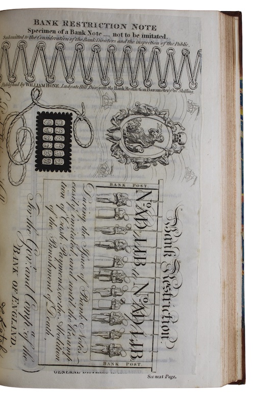 A collected edition of William Hone's (1780-1842) popular pamphlets, including his Bank Restriction Note (1820), a copper-plate engraving of an imitation of a £1 note, created in collaboration with Cruikshank, displaying a line of figures on the gallows. The note was an attack on the legislation which permitted the death penalty for the forging or passing of imitation paper money, a law which was popularly deemed too savage given the temptations involved and the opportunity for the persecution of innocent people. The note attracted much attention, as too did another joint parodic production, A Slap at Slop and the Bridge Street Gang (1820), a burlesque of John Stoddart's newspaper, the New Times. The years from 1819 to 1822 were perhaps Hone's most prolific period as a political satirist, during which he published such popular successes as The Queen's Matrimonial Ladder, Hone's Political Showman - at Home!, and Buonapartephobia.