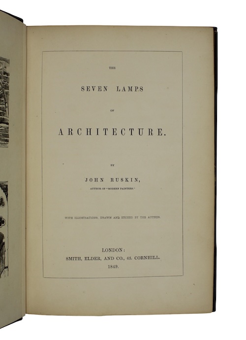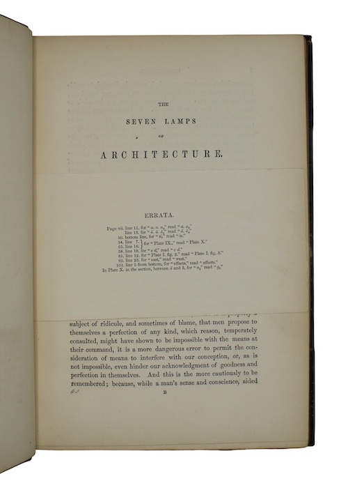 The first edition of art critic and social commentator John Ruskin's (1819- 1900) extended essay, The Seven Lamps of Architecture, in which the polymath establishes his seven 'lamps', or principles, of architectural integrity. The demands defined - Sacrifice, Truth, Power, Beauty, Life, Memory, and Obedience - serve Ruskin's argument for the restoration of architecture's spiritual significance, which he believes has been obscured by the technical prowess of the Renaissance and the Industrial Revolution. Ruskin expanded on these tenets in the three-volume The Stones of Venice (1851-1853), in which he proposes the values of the Seven Lamps can be deployed strategically to motivate social reform and encourage virtuous living.