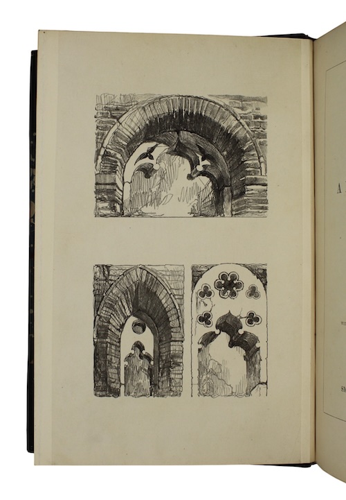 This copy features an additional plate of architectural illustrations by the author, inserted as a frontispiece. Originally intended for publication, Ruskin apparently rejected its inclusion before printing.