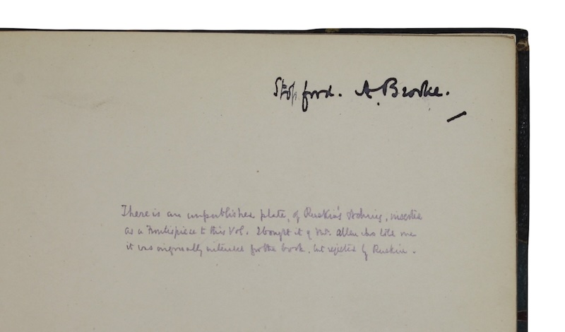 viii, [4], 205pp, [1]. With half-title, 14 plates, and a tipped-in errata slip. Extra-illustrated with an additional plate of unpublished Ruskin etchings. Contemporary green half-morocco, ruled and lettered in gilt, marbled paper boards, T.E.G., marbled endpapers. A trifle rubbed. Stopford A. Brooke's copy, with his inked ownership inscription to front blank fly-leaf.