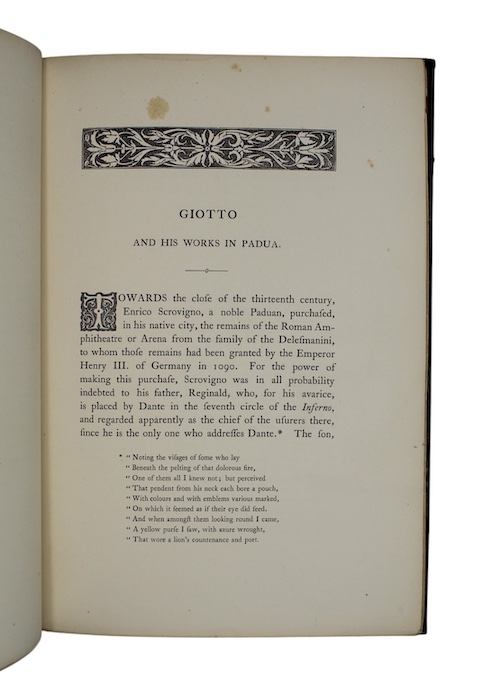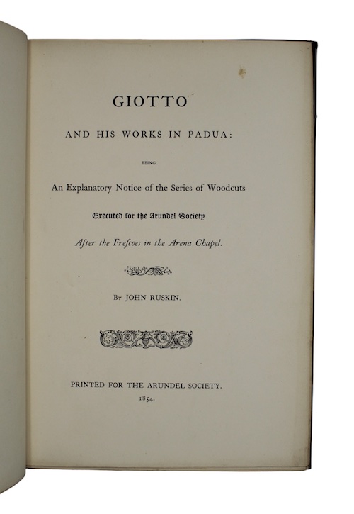 The first edition of English art critic John Ruskin's (1819-1900) examination of Giotto's painted Arena Chapel, Padua, first published by the Arundel Society between 1853 and 1860. An example of Ruskin's ekphrastic writing, the volume sought to provide readers with the closest possible experience to viewing Giotto's iconic frescoes for themselves. Ruskin, who attributed to Giotto a cohesive excellence uncommon for the time, claimed that 'The entire system of possible Christian Art is founded on the principles established by Giotto in Florence, he receiving them from the Attic Greeks though Cimabue, the last of their disciples, and engrafting them on the existing art of the Etruscans, the race from which both his master and he were descended.'