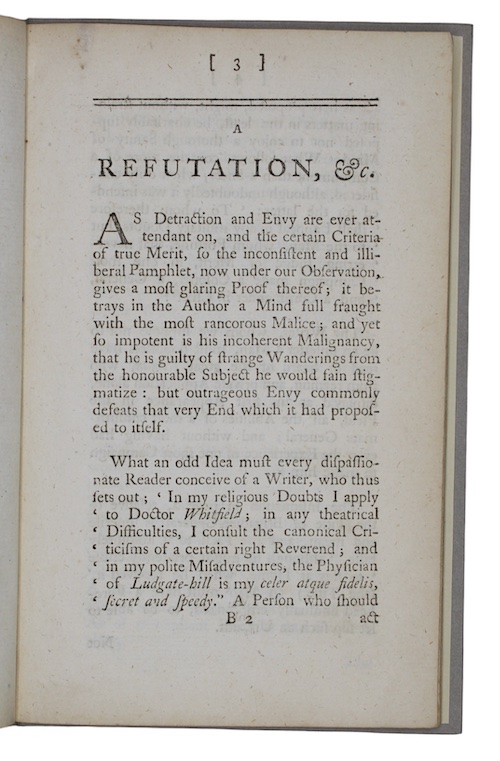 The third of four editions to appear within a year of a pamphlet, conjecturally attributed to Edward Thurlow, first Baron Thurlow (1731-1806), replying to charges of incompetence levelled against General George Townshend (1724- 1807) for his conduct whilst commanding British forces during the campaigns in Canada. Townshend, brigadier under Major-General James Wolfe, returned triumphant following the surrender of Quebec but was however tainted by accusations that he had endeavoured to embellish his significance in the battle in which Wolfe had been killed heroically on the verge of victory.