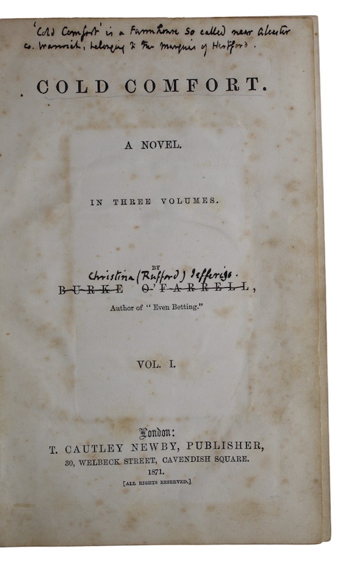 The sole edition of the second of only three novels published by Christina Jefferry [neé Rufford], issued, as with all her efforts, under the male pseudonym of Burke O'Farrell. All triple-deckers, her first novel, Even betting; or, which is the winner, appeared in 1869. Her third and final, Proud as Lucifer, in 1877. As with Cold Comfort, neither troubled the market sufficiently to warrant further editions.