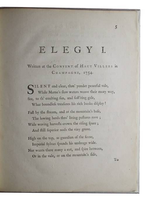 The first edition of poet and playwright William Whitehead’s (bap. 1715, d. 1785) elegiac verse, composed whilst accompanying his pupil, the then eighteen-year-old George Harcourt, Viscount Nuneham (1736-1809) on the Grand Tour (1754-6), and to whom he dedicates the third elegy here.