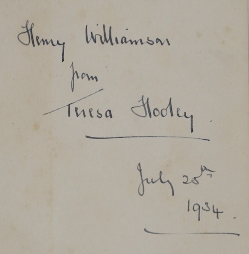 64pp. Original publisher's green cloth boards lettered in navy, with the unclipped cream dustwrapper printed in black. Wrapper a little marked and scuffed. With an ink inscription to Henry Williamson from the author dated July 25th 1934.