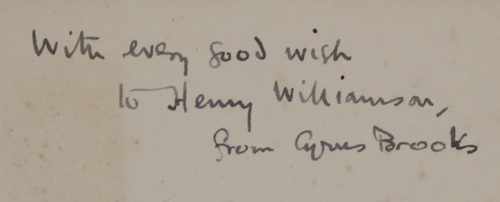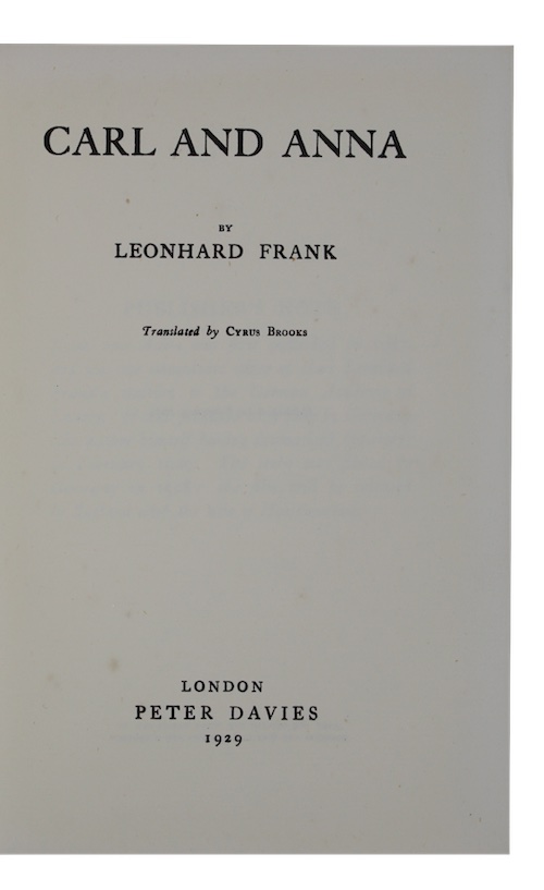 Inscribed by the translator Cyrus Brooks (1890-1951) to Henry Williamson, whose positive review of the novel appears on the front of the dustwrapper, comparing author Leonhard Frank (1882-1961) to German writer Arnold Zweig (1887-1968) in his novel Sergeant Grischa.