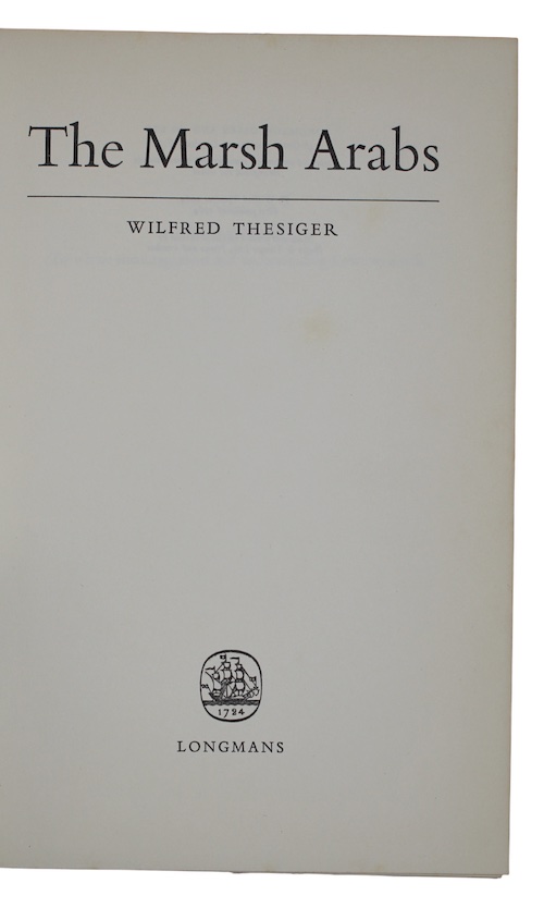 The first edition of renowned explorer Wilfred Thesiger's (1910-2003) account of eight years spent living among the Madan, or Marsh Arabs, the indigenous people of the Tigris and Euphrates in southern Iraq. Among others, he was awarded the Founder's Gold Medal from the Royal Geographical Society, the Lawrence of Arabia Medal from the Royal Central Asian Society, and the Livingstone Gold Medal from the Royal Scottish Geographical Society.