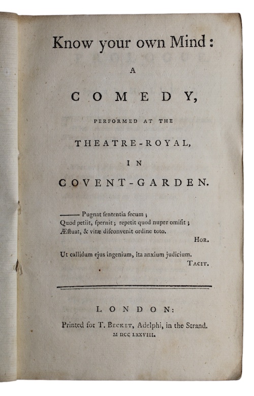 The first edition of playwright and actor Arthur Murphy's (1727-1805) popular comedy, based on Destouches' Irresolu, which had debuted at Covent Garden in February 1777, with an epilogue by David Garrick.