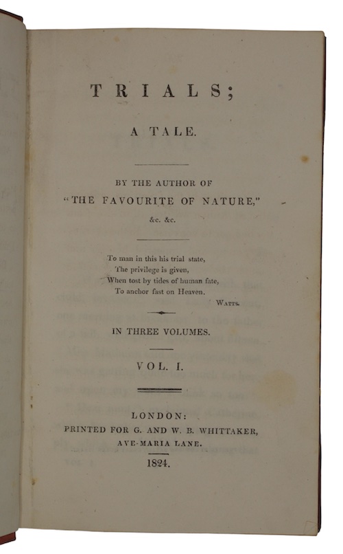 The sole British edition of Mary Ann Kelty's (1789-1873) third published triple decker sentimental novel. In 1821 Kelty published anonymously The Favourite of Nature, her first and most successful literary effort. It was favourably reviewed, praised as 'a tale which no mother need be afraid to place in the hands of her daughter' (Monthly Magazine, pp. 269-70). Harriet Martineau called it 'the first successful religious novel'. Further forays into the genre appeared with some frequency (Osmond (1823), The Story of Isabel (1826)), though they failed to excite the literary imagination of the public, and by 1827 Kelty renounced her novelistic career, turning, thanks to the overbearing influence of evangelical preacher Charles Simeon, to producing religious tracts. Over the last three decades of her life she issued a plethora of devotional reflections on spirituality in domestic life and two affecting autobiographical testimonies, Reminiscences of Thought and Feeling (1852) and The Solace of a Solitaire (1869).
