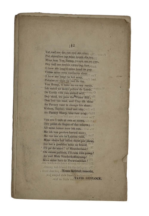 'Den Von Tromp, you now shall shee / De noble Warren call'd on me; Dare I felt proud of mine words / To nock all down before de Lords. He said, pray witness who are you? / I'm Shylock still, de nobil Jew, De larchest marshant in de town: / I'm worth ten hundred million poun, I've sheeps on sea, an housh on shore, /An monish in de pank galore'.