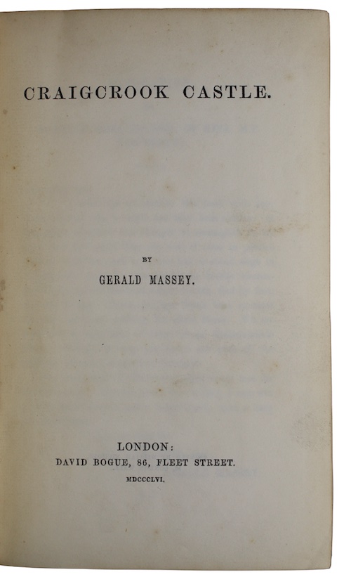 The first edition of minor Victorian poet, social reformer, and Egyptologist Gerald Massey's (1828-1907) blank verse epic that 'may be read as a continuous Poem, or divided into separate Poems'. The book is dedicated to art historian and book collector Sir William Stirling-Maxwell (1818-1878), tenant of Craigcrook Castle, who, in 1855, had offered the use of the grounds to Massey, then in Scotland's capital as an editor at the Edinburgh News.