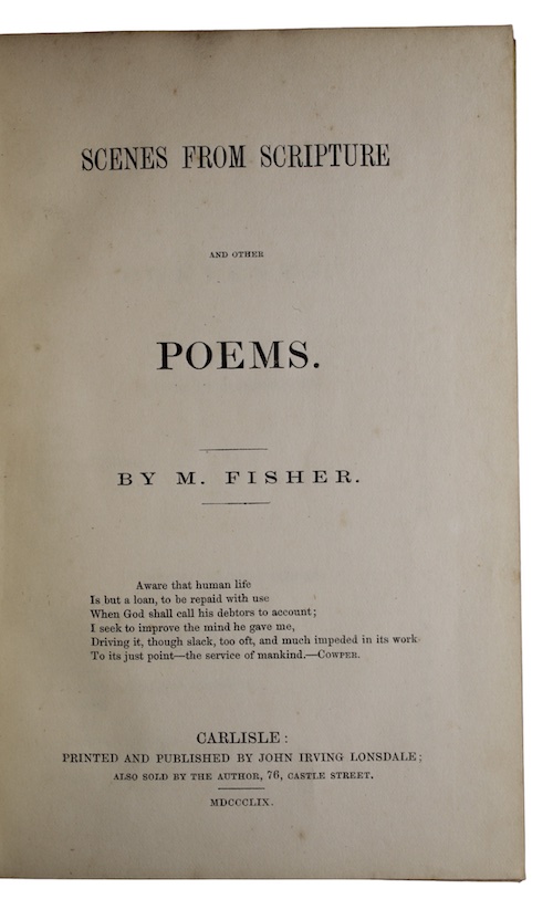 A fine copy of the first edition of a collection of poems by a female, presumably Scottish, author. The poems, though predominantly devotional do include some notable curiosities such as; 'Lines on Sir J. Franklin's Expedition' commemorating the arctic explorer's final fateful voyage, an attempt to traverse the Northwest Passage; 'On the Comet of 1858', and two compositions celebrating the successful laying of the first transatlantic telegraph cable.
