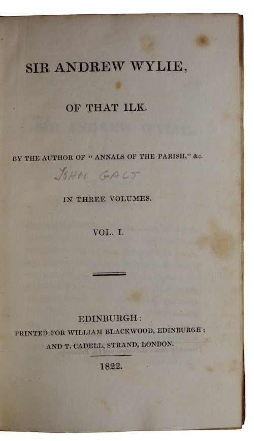 John Galt (1779-1839), Scottish novelist, entrepreneur, and social commentator. As one of the first writers to deal with issues arising from the industrial revolution, Galt has been styled as an inaugural figure of political novelisation. Sir Andrew Wylie concerns a lowly Scottish peasant boy who, through his own wit, elevates himself to the highest echelons of London society.