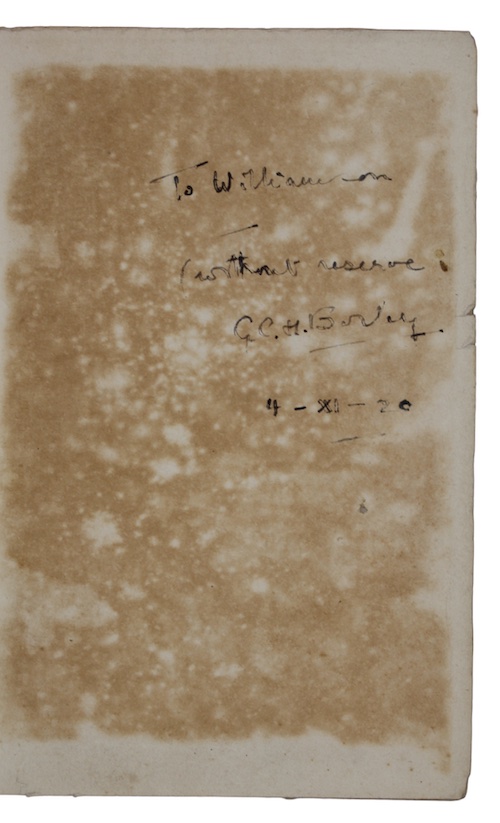 306pp, [22]. Original publisher's red cloth boards blind stamped and lettered in brown. All edges shelf-worn with corners bumped, significant fading and staining to boards. Endpapers are toned though otherwise internally bright. Author's inscription to FFEP reads 'To Williamson, without reserve. G. C. H. Borley. 4-xi-20. Pencil notes by Williamson state he was given this copy by the author, who was a brilliant speaker and Rhodes scholar, on a Thursday night at the Tomorrow Club in 1920.