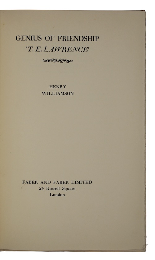 The first edition of Henry Williamson's (1895-1977) memoir of his friendship between T. E. Lawrence. Williamson's book Tarka the Otter attracted the attention of Lawrence, whose letter of praise started a correspondence between the two. Indeed, Lawrence's fatal motorcycle crash in 1935 occurred as he was returning from a trip to the post office to send a telegram to Williamson. The Henry Williamson Society produced a facsimile reprint, limited to 500 copies, in 1988 to mark the centenary of Lawrence's birth.