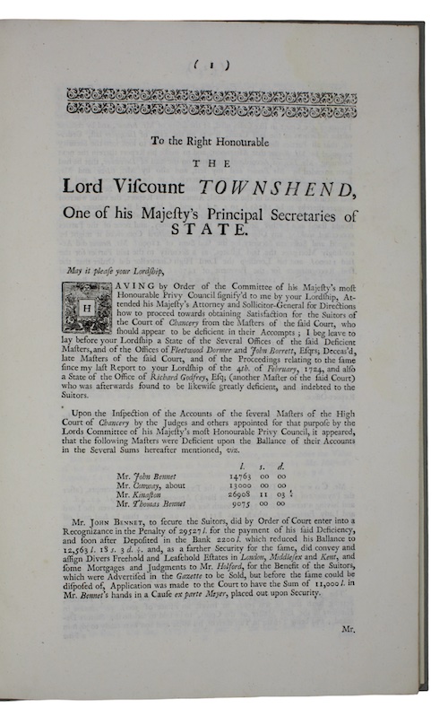 The report of the state of the Offices of the Deficient Masters of the High Court of chancery, made to The Right Honourable the Lord Viscount townshend, One of his Majesty's Principal Secretaries of State.