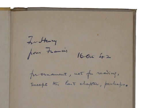 Original publisher's pale-yellow cloth lettered in red, with the decorative unclipped dust wrapper. Small nick to front board, otherwise crisp. Wrapper a little creased and frayed without major loss. With the ink presentation inscription to FFEP 'For Henry from Francis, 16 ou '42. for ornament, not for reading, sweepe the last chapter, perhaps.'