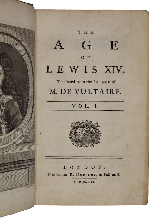 The first edition in English of Voltaire's (1694-1778) Siècle de Louis XIV, widely considered the foundational text of French literary history. Although an earlier, preliminary essay-draft had appeared in 1739, the work first appeared in its entirety in French in 1751.