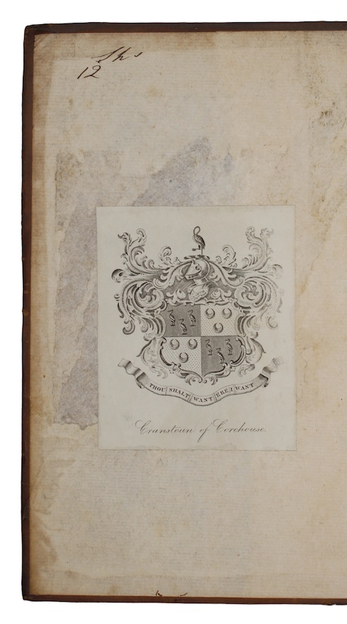 In two volumes. viii, 436; [2], 292, 90pp, [20]. With an engraved frontispiece to each volume. Contemporary gilt-tooled sprinkled calf, contrasting red morocco lettering-pieces. Rubbed, numerous worm-holes to dulled spines, corners bumped. Minute worm-track to foot of initial four gatherings of Vol. II, short tears to margins of leaves Q3-4 of same, central horizontal tear to leaf c4 (appendix) without loss of sense. From the recently dispersed family estate (by descent) of George Cranstoun, Lord Corehouse (1770-1850), Scottish jurist, satirist and friend of Walter Scott and Lord Monboddo, with his armorial bookplate to both FEPs.