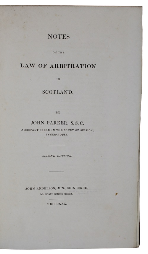 The second edition, in original state, of Principal Extractor in the Court of Session John Parker's authoritative survey concerning arbitration agreements in Scotland from the early seventeenth-century up to 1828. The first edition is apparently unrecorded. Bell and Bradfute issued a 'second', enlarged edition in 1845.