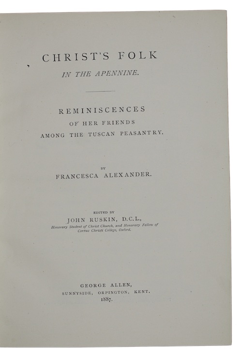 The first edition in book form (Originally issued as a part work, each part being sold separately at one shilling in printed wrappers) of Francesca Alexander's (1837-1917) account of the social life and customs of the residents of Tuscany, edited by John Ruskin (1819-1900)