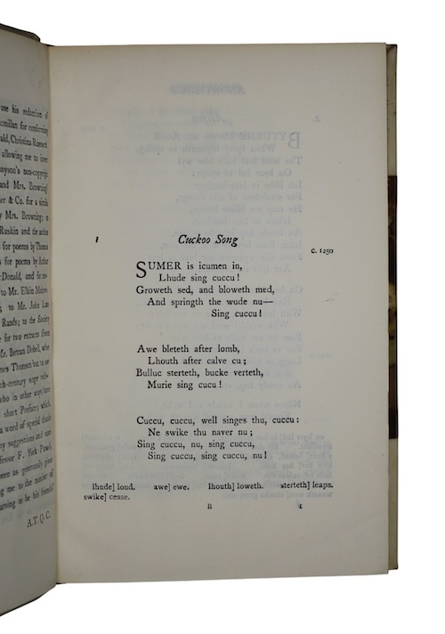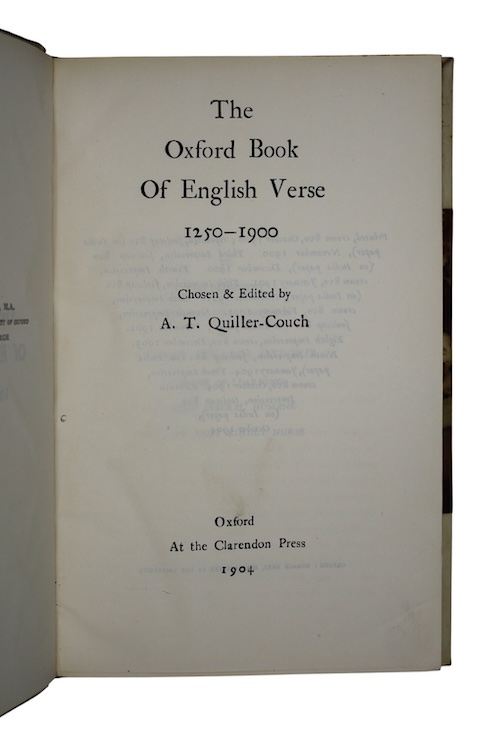 An attractively bound copy of the monumental Oxford Book Of English Verse, selected and edited by English writer Sir Arthur Thomas Quiller- Couch (1863-1944), in its distinctive India Paper edition; its compact nature led to this impression serving frequently as a 'knapsack book' across the British Empire and in the military.