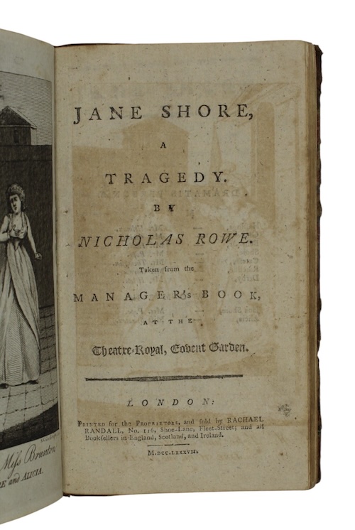 [Bound with:] ROWE, Nicholas. Jane shore, a tragedy... London. Printed for the Proprietors, and sold by Rachel Randall, 1787. 43, [1], 3pp, [1]. With an engraved frontispiece and two terminal leaves of publisher's advertisements. ESTC N45718.