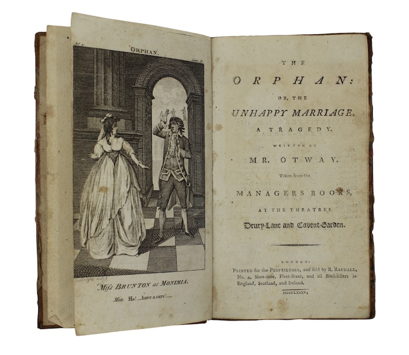 The first of Restoration dramatist Thomas Otway's (1652 -1685) acclaimed blank verse tragedies, The Orphan: or, the Unhappy Marriage, which premiered at the Dorset Garden in 1680. The engraved frontispiece depicts English actress Ann Brunton Merry (1769-1808), under her stage name, 'Miss Brunton', in the role of the heroine Monimia - a significant role to achieve in her first year on stage. It is possible that the single 'T' lettered in gilt to the spine simply stands for 'Theatre'.