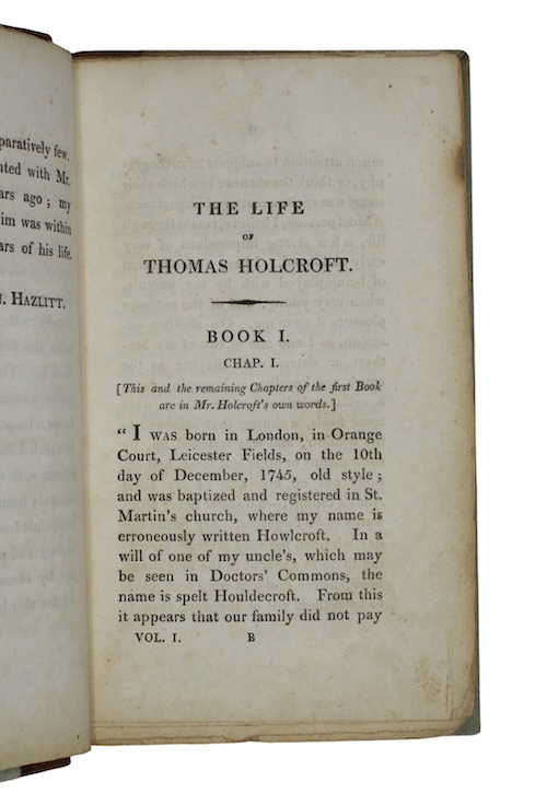 The first edition of English dramatist and miscellanist Thomas Holcroft's (1745-1809) posthumous memoir, completed after his death by pre-eminent literary critic and essayist William Hazlitt. Reprinted, albeit abridged, in 1852, contemporaries raised questions as to the memoir's accuracy - it appeared to many that Hazlitt had simply taken large stretches of the narrative from Holcroft's partially autobiographical novel Alwyn (1780). Holcroft, best remembered for his political career and activism, assisted in publishing the first part of Thomas Paine's The Rights of Man in 1791. As a result of his reformist campaigning, he wound up indicted in Newgate for High Treason by 1794 - thankfully, the acquittal of his compatriots resulted in an eventual release. His later dramatic works, Deaf and Dumb (1801) and A Tale of Mystery (1802), contributed to the early popularisation of melodrama in the English theatrical sphere.