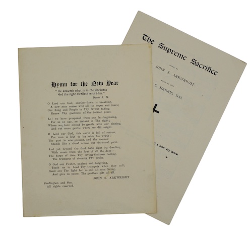 78pp, [2]. With a terminal colophon leaf. Original publisher's black rexine, lettered and tooled in gilt. Top edge gilt, ribbon frayed. Corners bumped with small losses to spine. Internally bright save light toning. Loosely inserted are two hymn sheets, one bifold with music for The Supreme Sacrifice, and a single lyric leaf of 'hymn for the new year'.