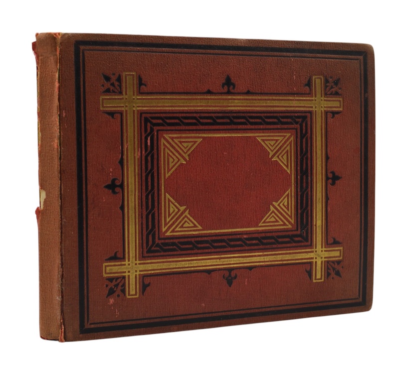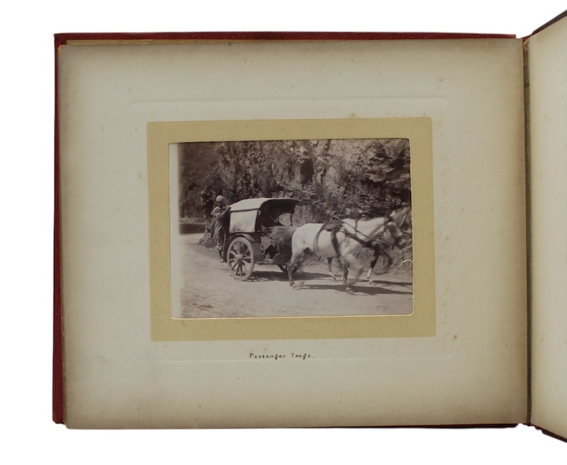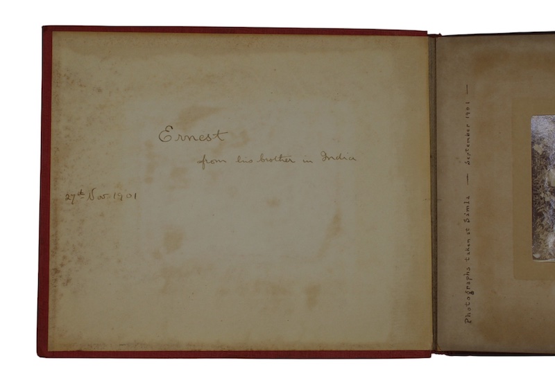 12 photographs mounted on six leaves, captioned in manuscript. Contemporary red cloth, stamped in gilt, black, and blind. Rubbed, marked and dulled, joints split, some loss to spine. Contemporary inked gift inscription to FEP: 'Ernest / from his brother in India. / 27th Nov. 1901'.