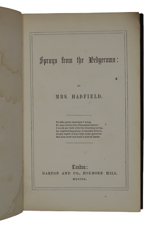 The sole edition of a collection of sentimental verse, 'written during brief intervals of leisure in the life of a busy mother', by Liverpool-based Quaker poet, Elizabeth Hadfield, of whom little is known. The British Friend (April, 1855. p.98) reviewed the work favourably, noting that although Hadfield's religious sentiments are unexceptional, 'her verses flow sweetly'.